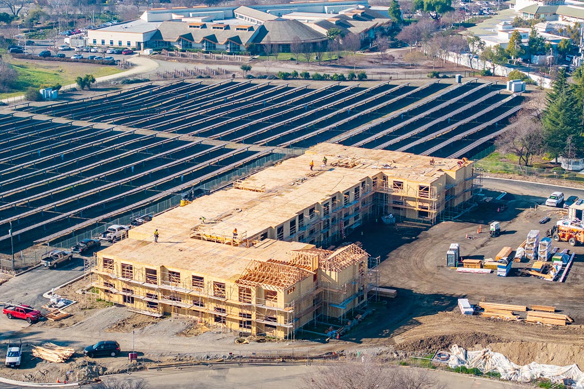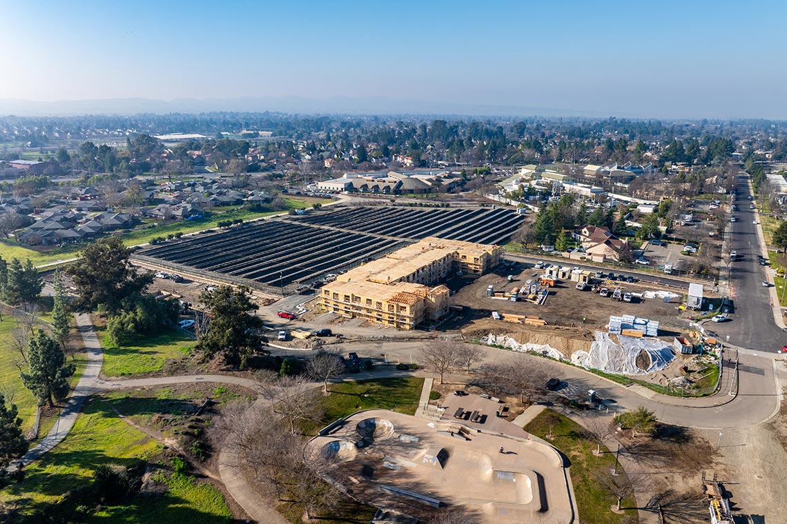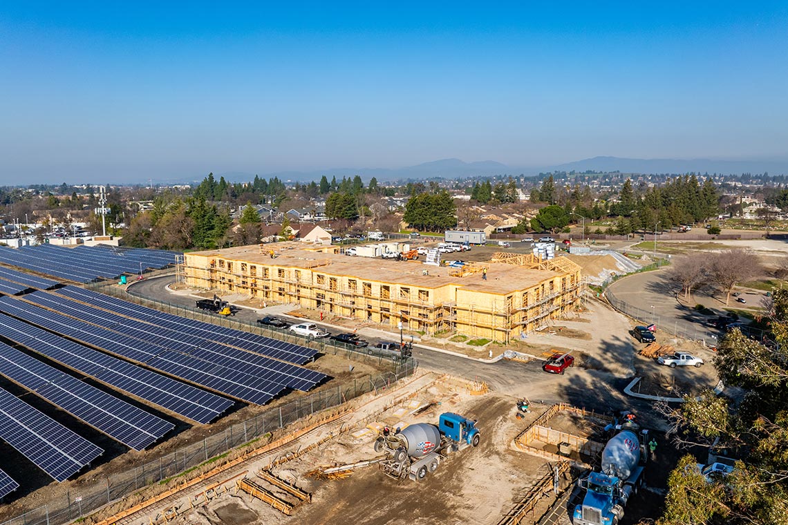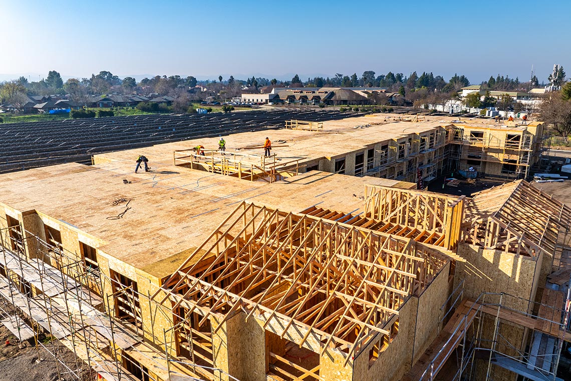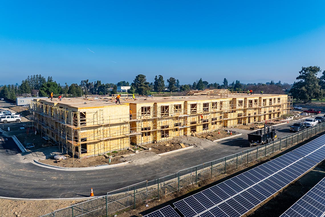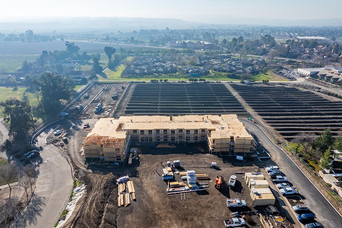 This 79-unit senior affordable housing community consists of a new four-story, Type VA wood-framed structure with a mix of one- and two-bedroom units. The building includes common areas, utility spaces, and a central courtyard with raised garden beds, lounge seating, and bocce ball court.